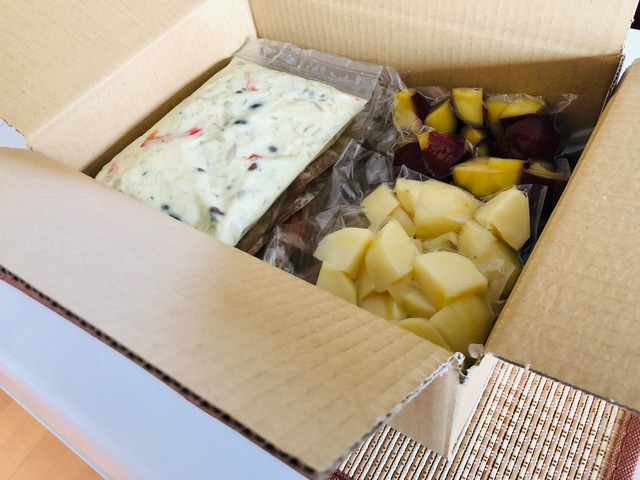 それと、今回の新商品に入っていたサツマイモは以前より冷蔵庫に在庫がなくなったら注文していたのですが、父に食べてもらったときに水分がちょっと多いなと感想を受け、水分を少し飛ばしたら蒸発した分、甘みがサツマイモの中に凝縮するかなと思い邪道であるのを承知の上で焦げない程度にオーブンで実験し、水分が飛び、ちょっとホクホクの触感になりました。